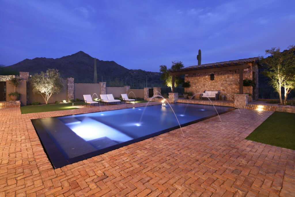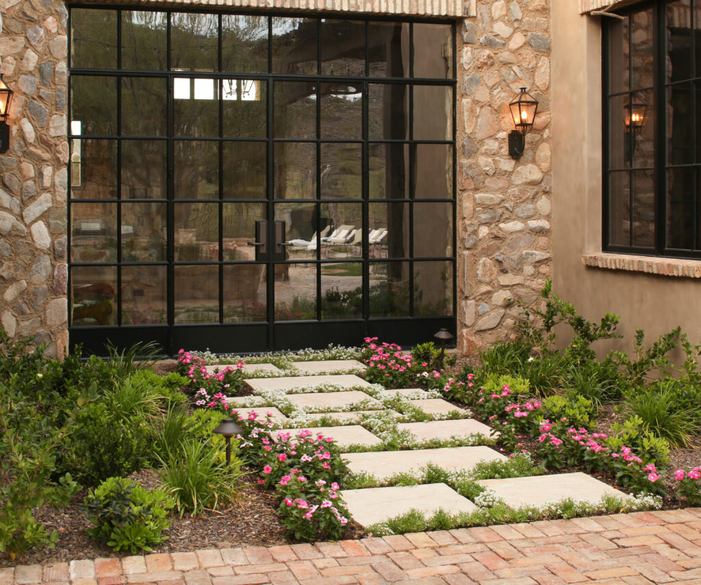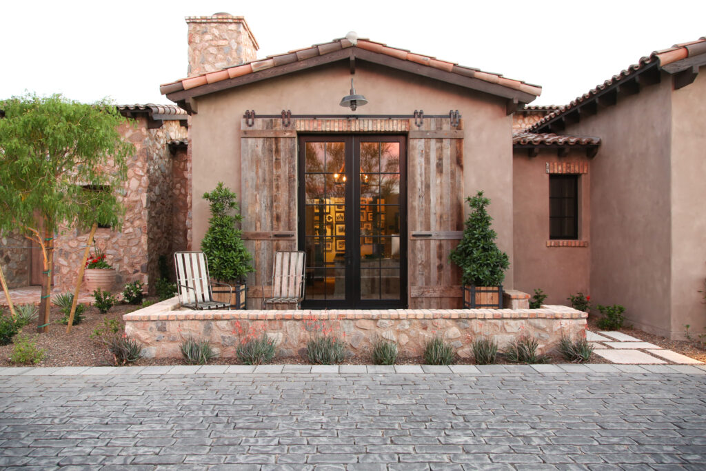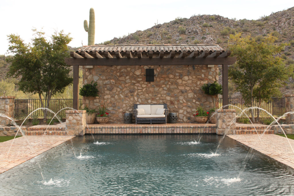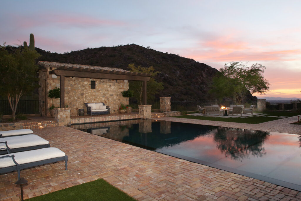 Locally sourced stone and indigenous materials ground the landscape in its Sonoran Desert setting, while features like the cobblestone auto court add historic charm. The driveway entry is framed by a stunning canopy cover, setting the tone for a design that flows effortlessly from natural desert to structured outdoor living.