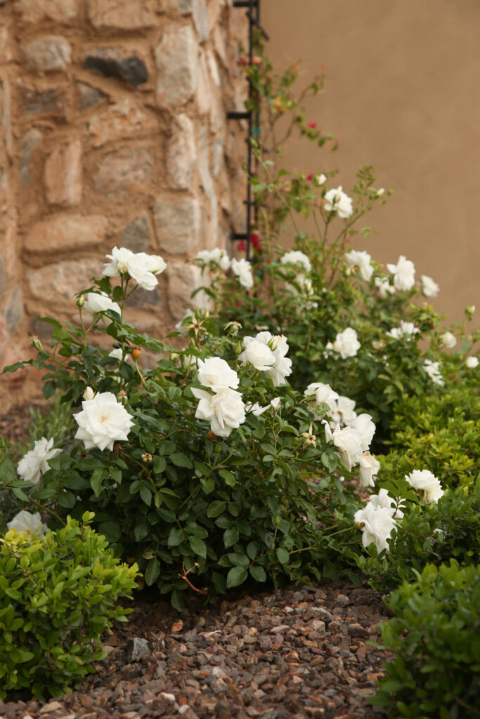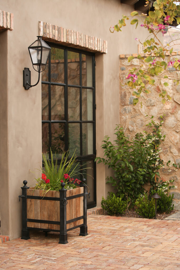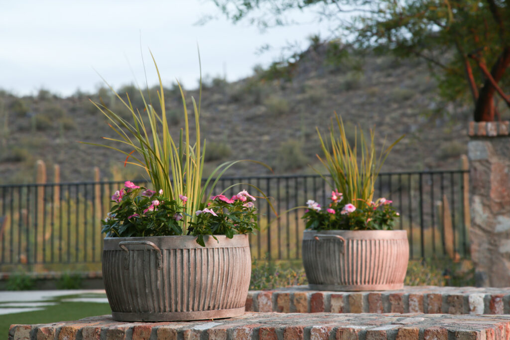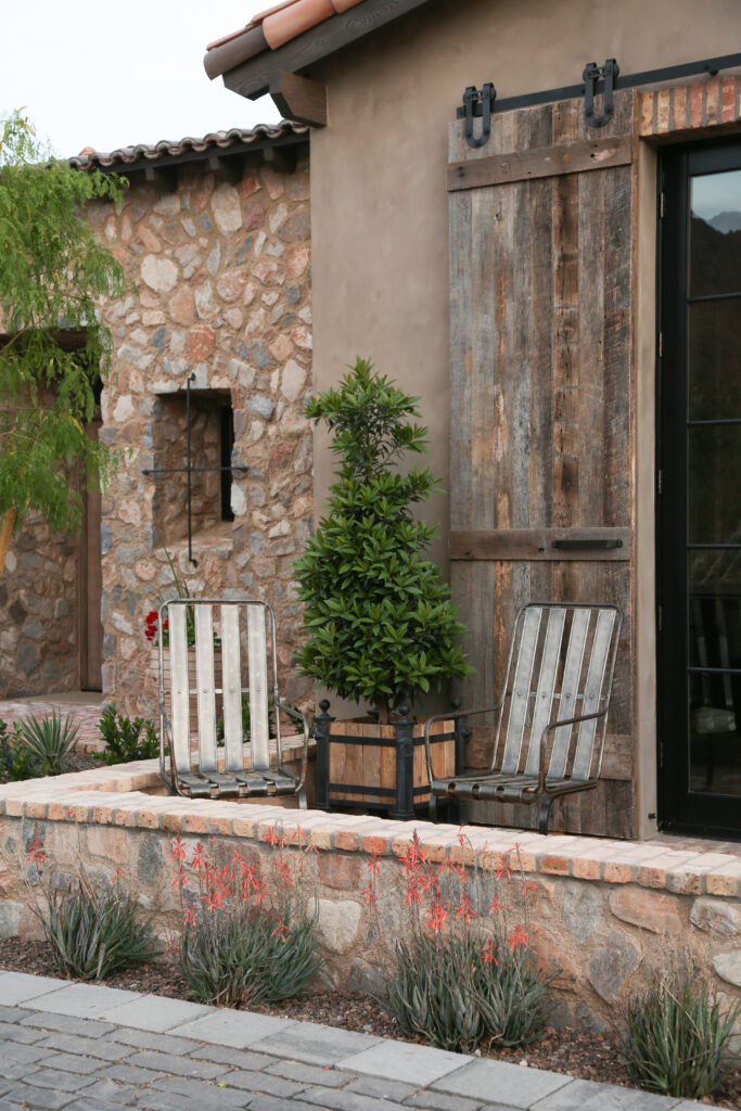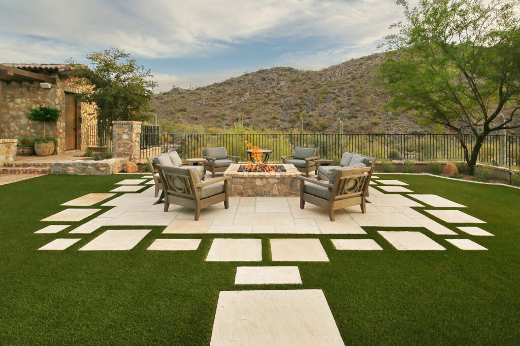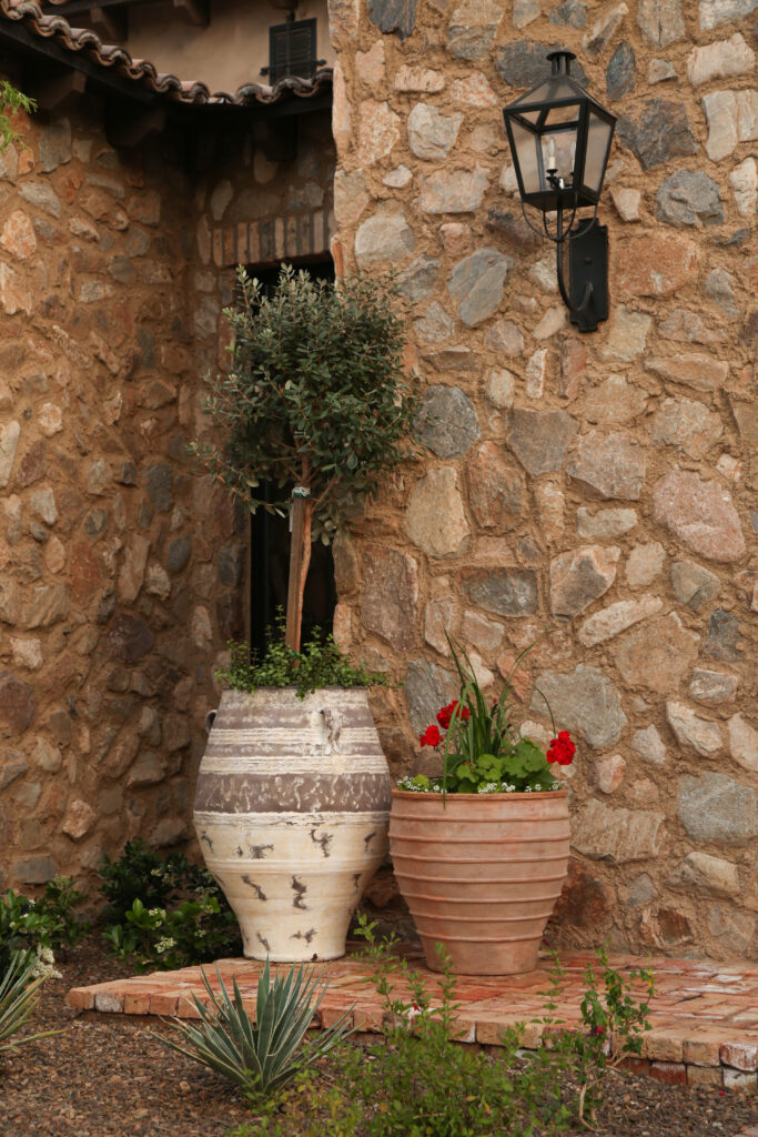 Locally sourced stone and indigenous materials ground the landscape in its Sonoran Desert setting, while features like the cobblestone auto court add historic charm. The driveway entry is framed by a stunning canopy cover, setting the tone for a design that flows effortlessly from natural desert to structured outdoor living.