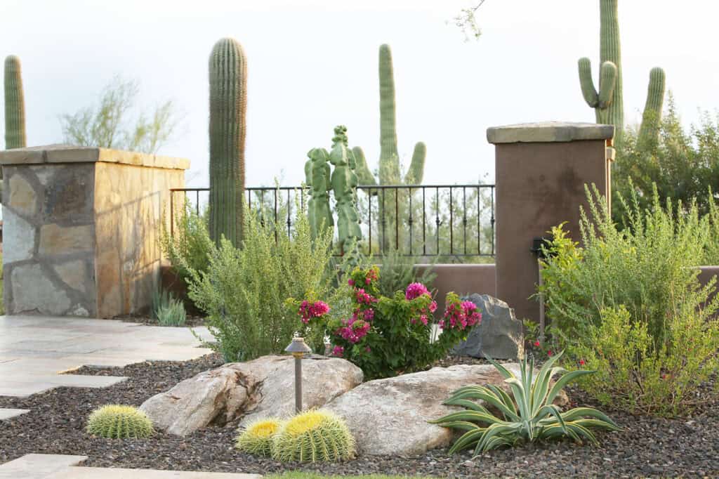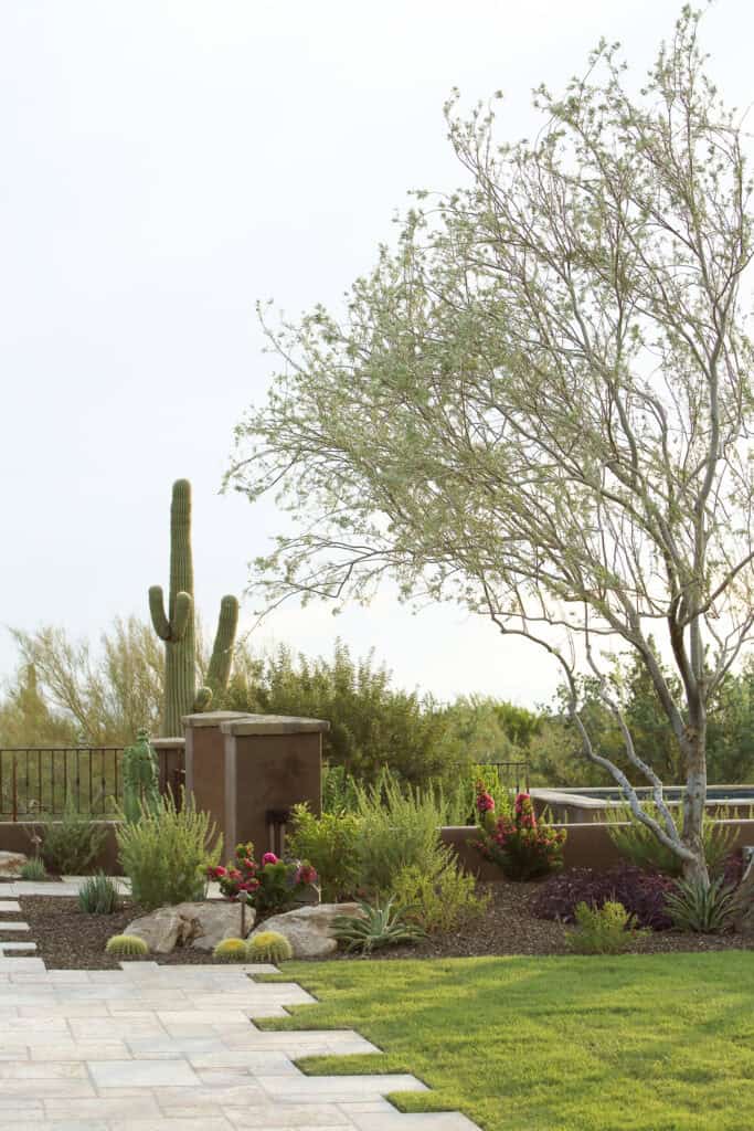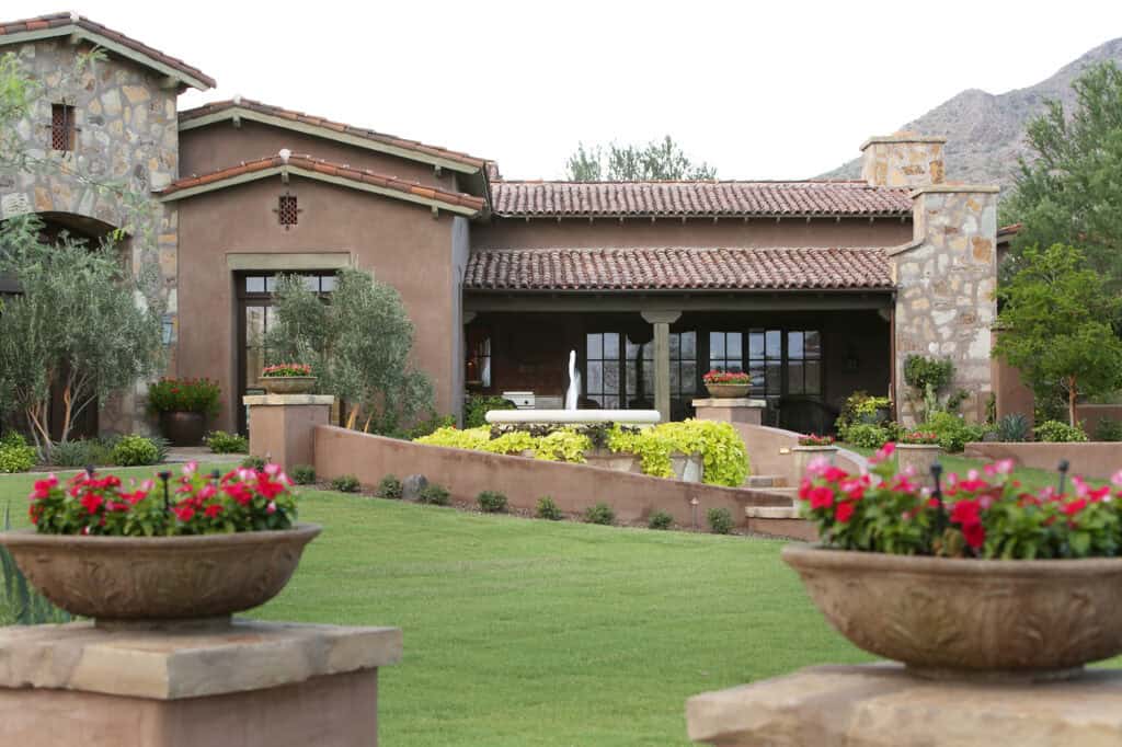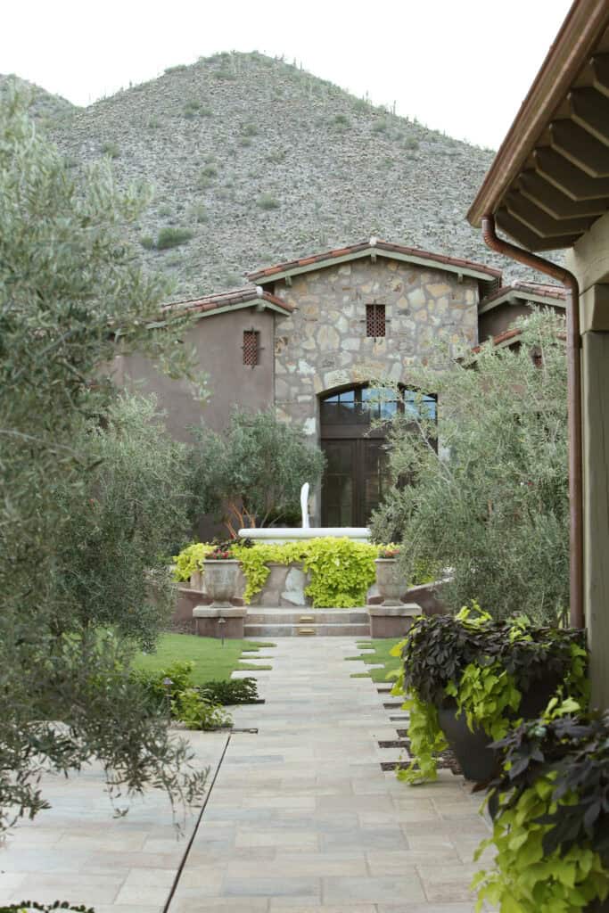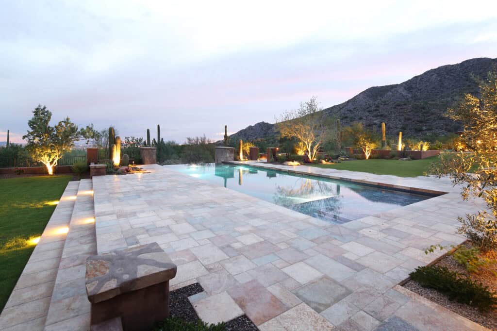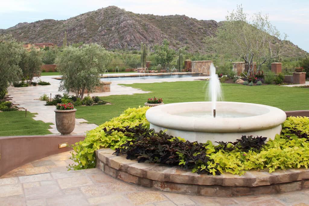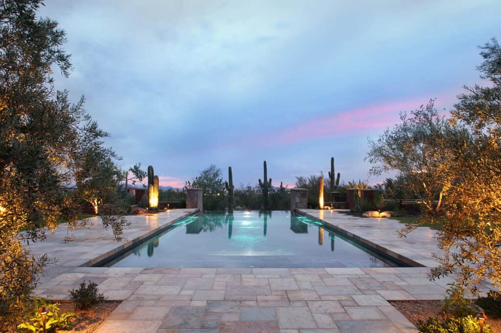 They expanded on their current property, bought the lot next to them, and added a large game room/guest house with a second pool. This was a large hillside remodel with a fair amount of grade change, but wow did it turn out amazing! This addition includes a large all tile negative edge pool, huge detached all tile spa that overlooks the natural desert, large rolling lawn areas where kids can play & pets can run with a really special “line of site” & walkways leading to each destination. The focal point is a fountain that anchors the back yard to great effect.