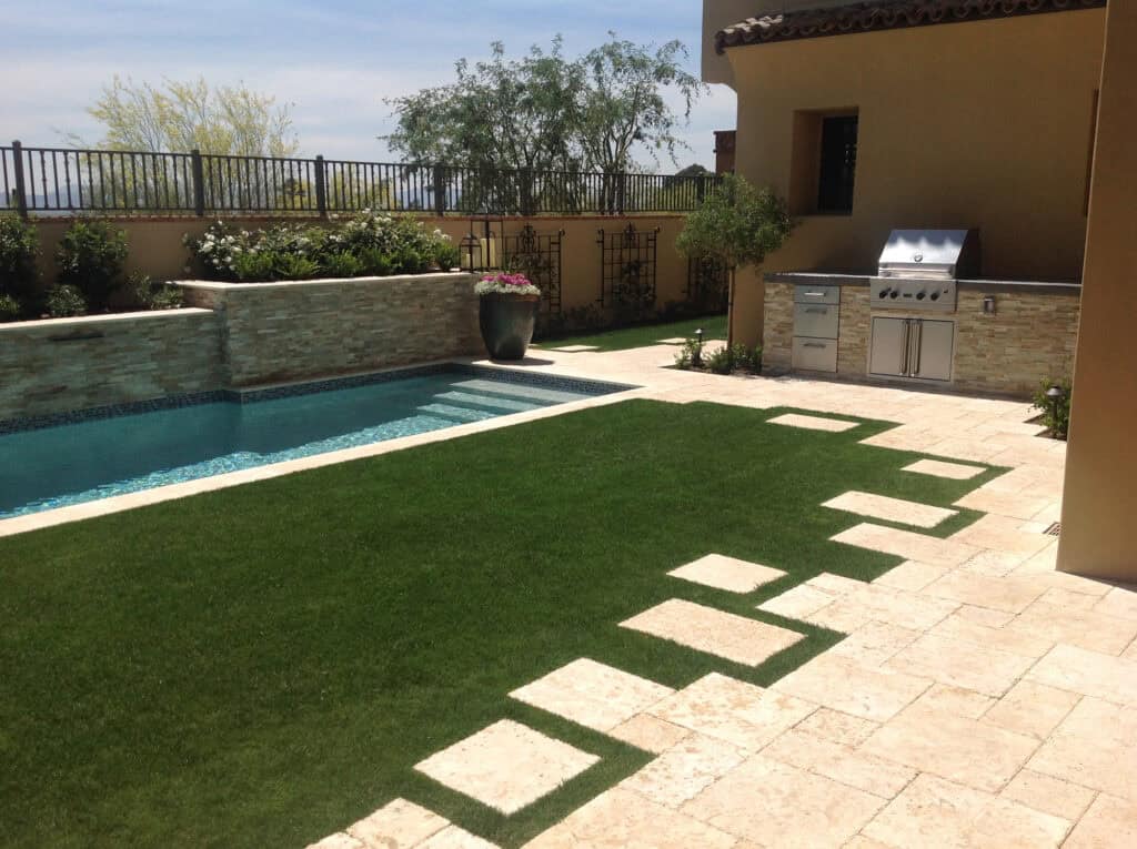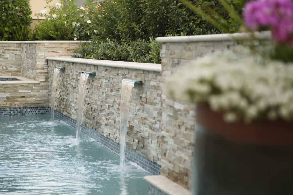 The existing pool & landscape didn’t match up with the client’s style, so we went to work. This site’s footprint had less square footage than many yards we deal with, so we got creative to incorporate all of the client’s elements. The most obvious example of this is in the transition & balance between lawn & patio spaces. I love the patio’s irregular edge as it breaks away into the usable area of the lawn. In the design, we intentionally downplayed the walls & home’s straight lines to adds interest to the complex layout.