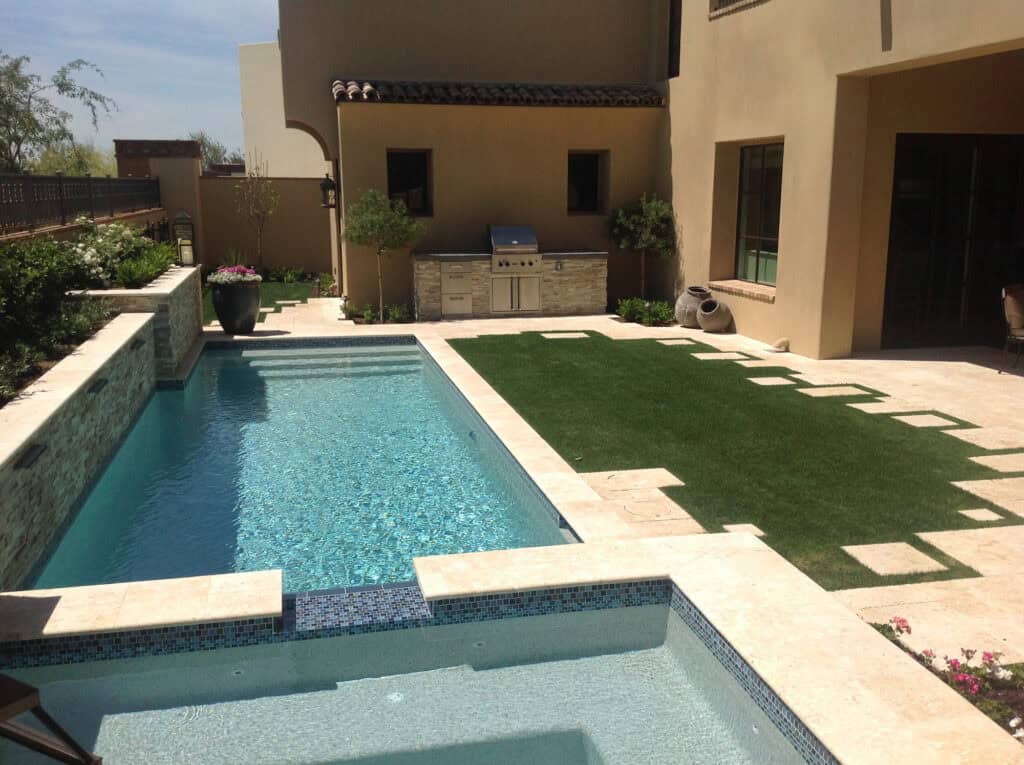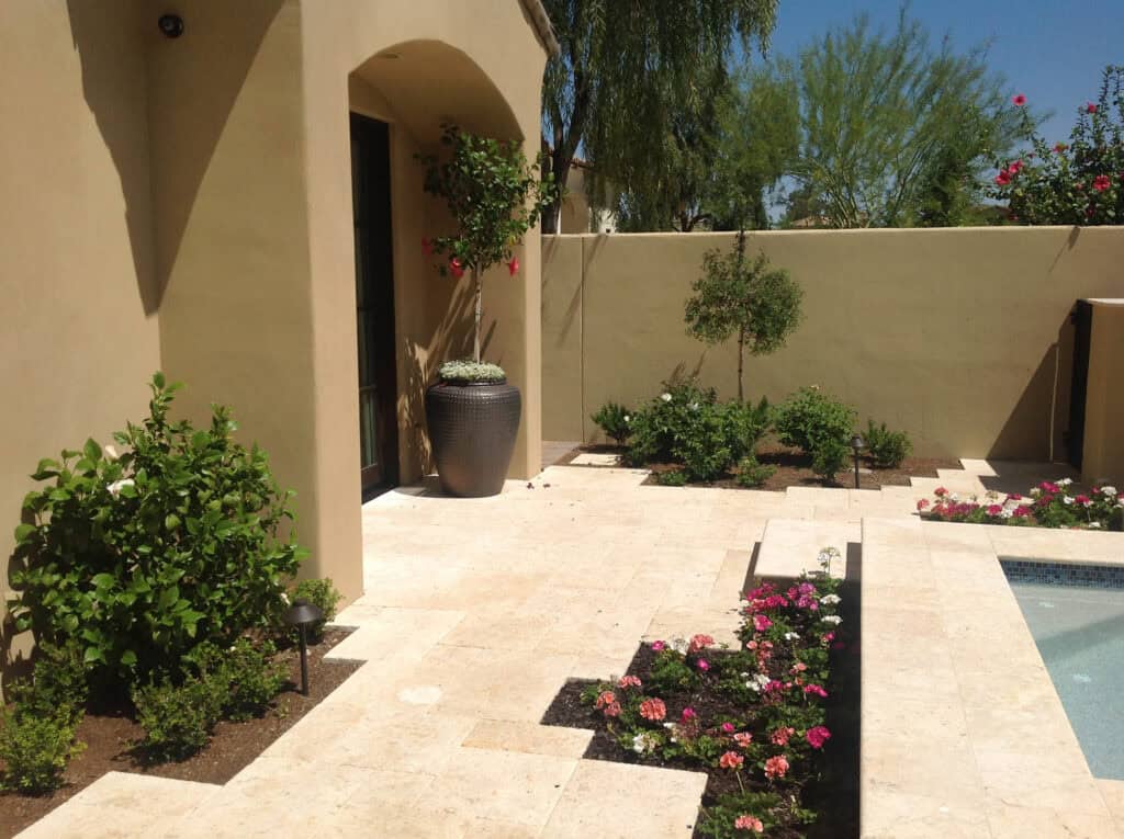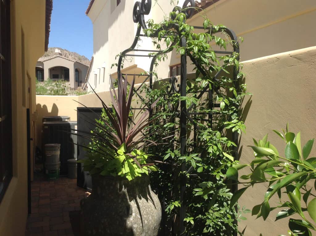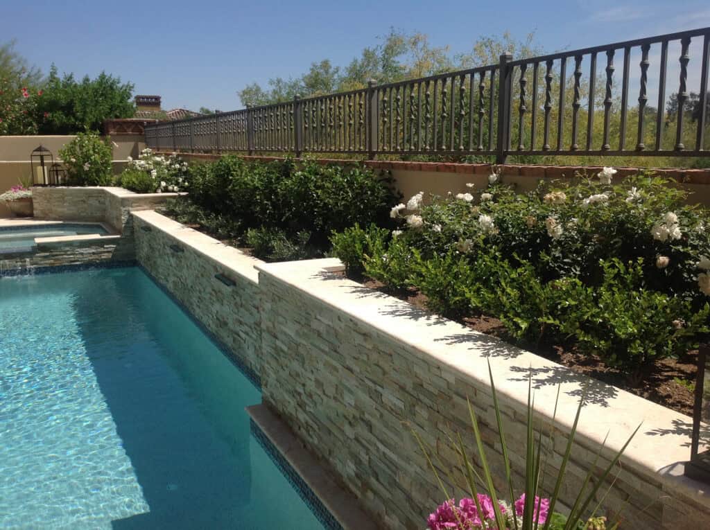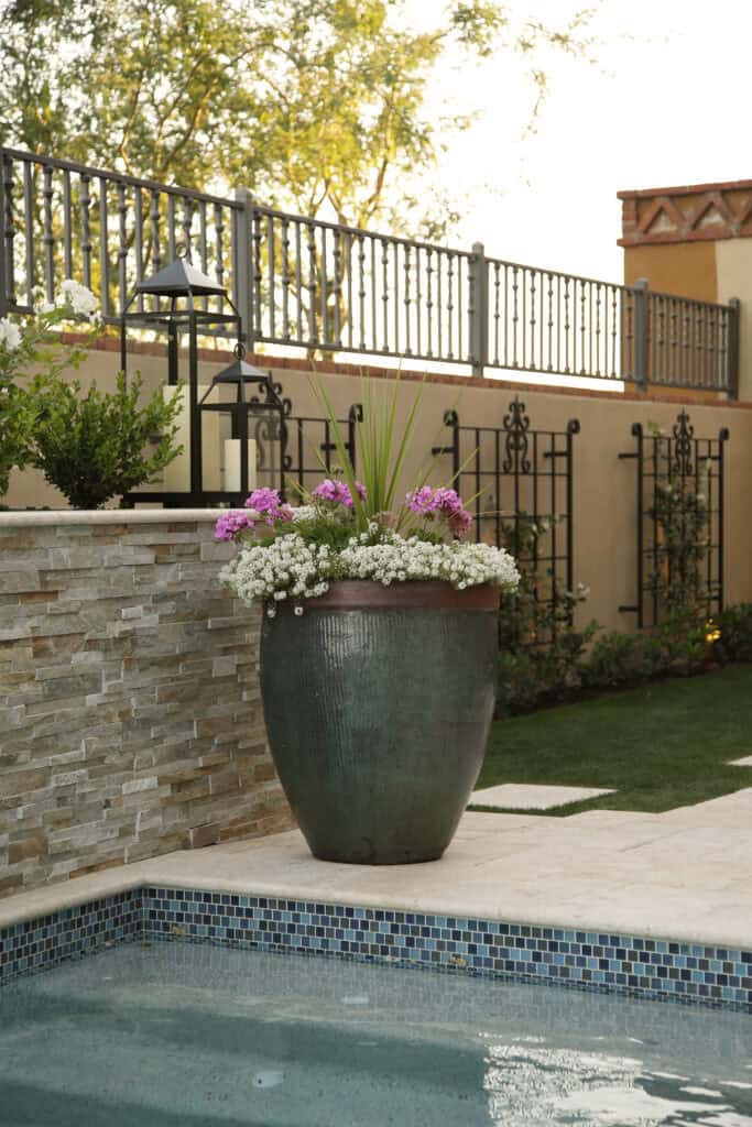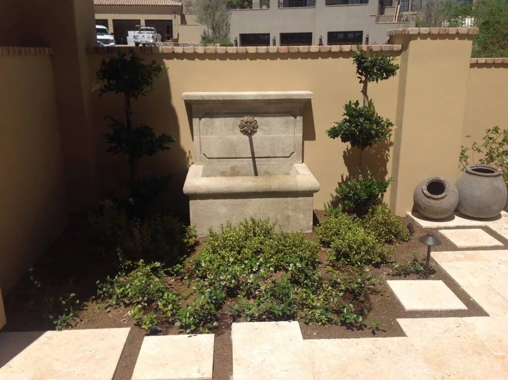 In the pool, we added a new interior, waterline tile, patios & raised stacked stone walls at the back of the pool/spa that housed fountains & layered plantings. This simple addition provided drama, color & interest that and added much to the backyard. The custom wrought iron trellises were a nice touch as well. We can’t forget about the front courtyard! What an excellent entertaining space for an intimate gathering of friends with an outdoor fire pit accompanied by a soothing wall fountain for ambient noise. We are proud of how this unique Paradise Valley retreat turned out!