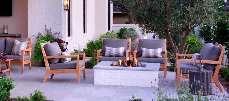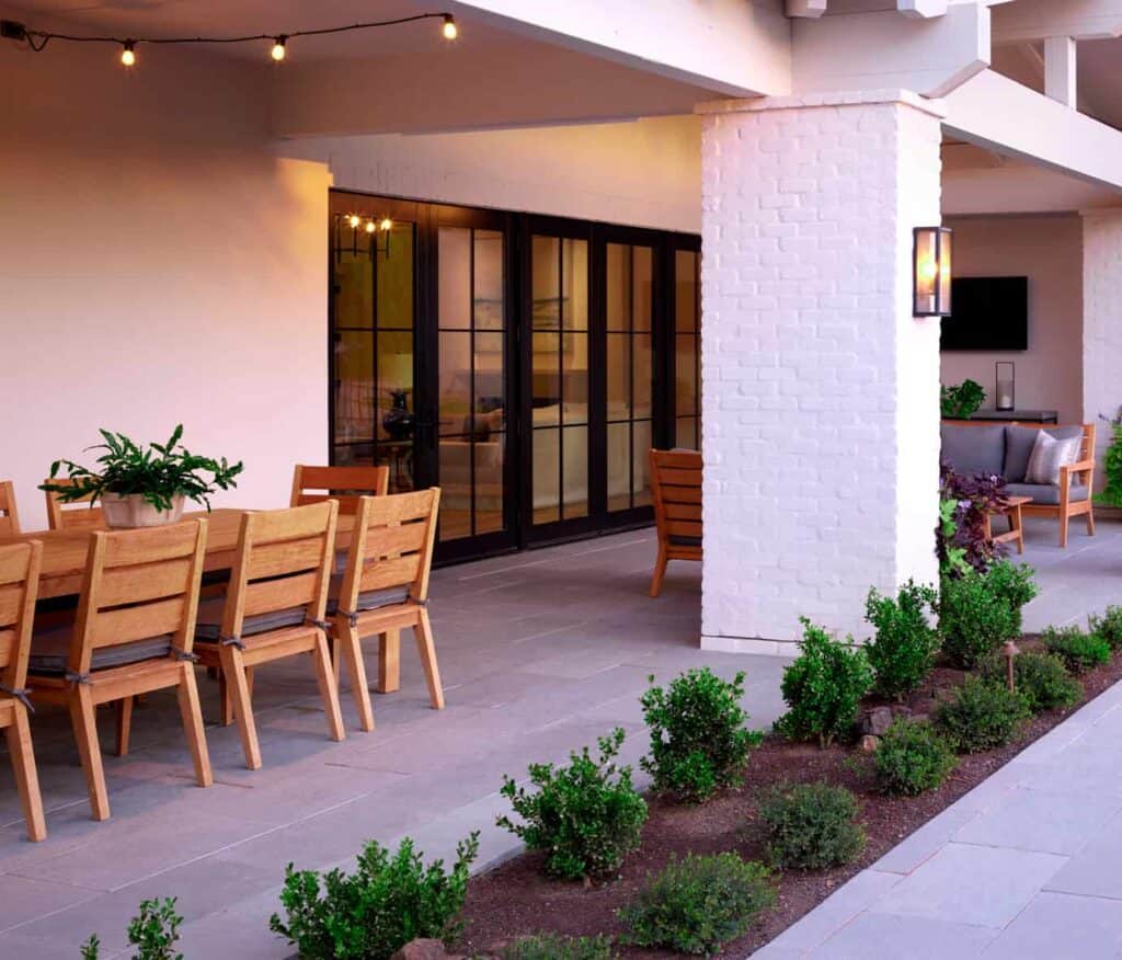 To create more fluid gathering spaces, the open floor plan centers around a great room that opens up to the patio and backyard, which was landscaped by Brandon LaCombe. “The indoor-outdoor living space gives them that feel they were looking for,” notes Wyant. Through the French doors, guests can filter around the alfresco dining area and seating nook surrounding the fire pit, or wander back inside, where the built-in bar has become a favorite place for cocktails. “My husband likes to face our friends and family when he’s serving them,” says the wife. “So that’s been a fun little aspect to play with.”